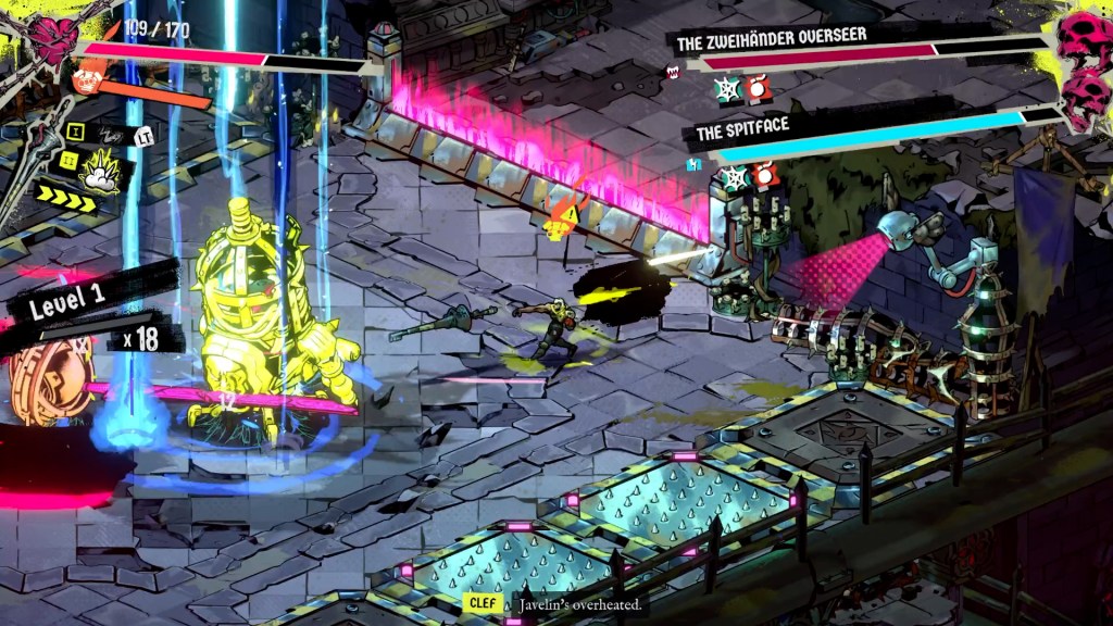 You play as Clef, a former child soldier turned rebel hell-bent on overthrowing the Queen. Using your fists and a versatile, motorized javelin, you will fight, lose, and fight again as you make your way to the throne room for a rowdy audience. To progress, you unlock a certain number of vaults per room through combat encounters, which earns you upgrades and raises the bridge for the next level. In Clef’s path stands stunningly-drawn characters who offer banter but not a fight, and high-tech machines who have a little too much fight. And those damn spikes.