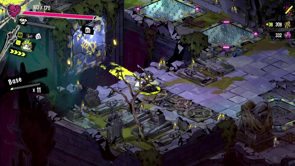 Traps aren’t abnormal for rogue-likes and the active participation in their use here is rewarding, but the spikes are everywhere! They started shifting from tool to nuisance after I walked into one after letting my guard down post-fight and went to collect my hard-earned spoils. Then, there are the times I lost sight of the floor amid all the visual noise and accidentally dashed onto the trap. Oh, and let me not forget the instances where my spatial perception was slightly off and I dashed onto the spikes’ edge instead of over it as I tried to get more health. That last one’s more of a personal failing, but ends up getting highlighted when the other two happen more than a few times.