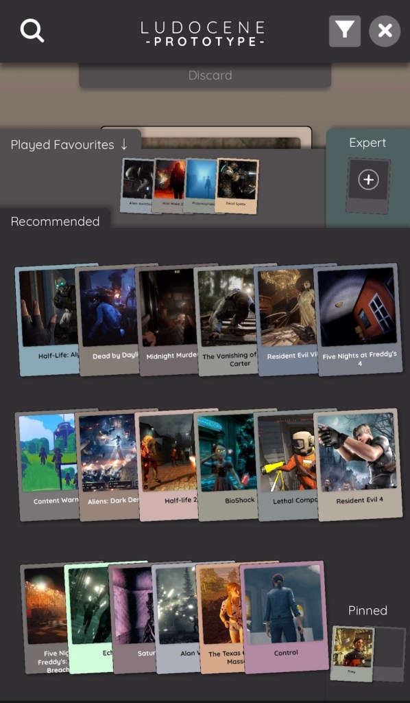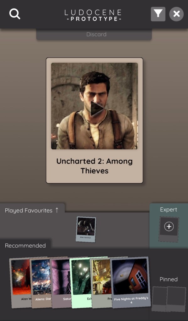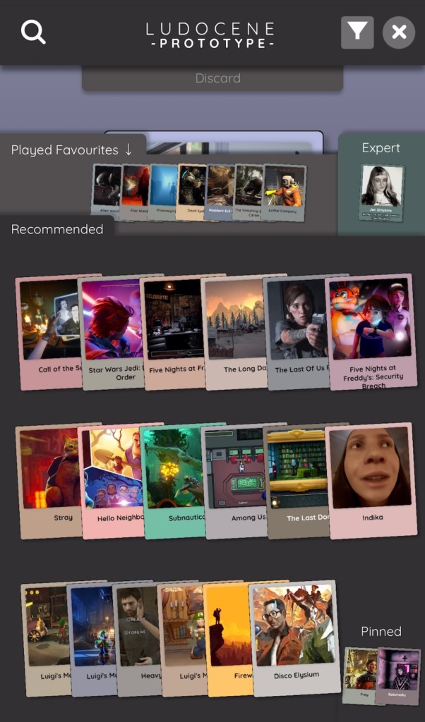 Ludocene isn’t perfect by any means. Part of that is it’s still a prototype, so I ran into a couple bugs. A card would get selected from my ‘Recommended’ try, but then take a few taps to get back into its resting position when I decided not to do anything with it. The first time I swiped up on an expert card, a new one didn’t appear. I selected cards that I didn’t intend to because my fingers hit the sweet spot between two of them (something I imagine being less of an issue with a mouse). It’d also be nice if the Pinned section could hold more than two cards, but that might just be the greed in me.
