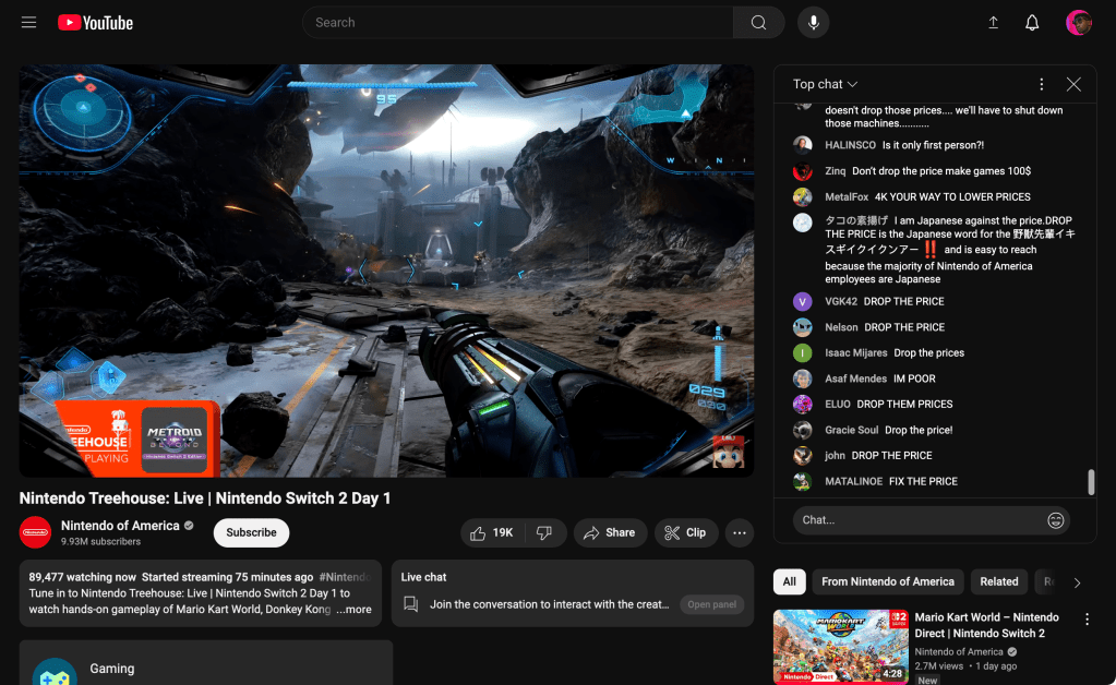 There was wave after wave of viewers screaming “DROP THE PRICE,” with stray islands of other phrases including, but far from limited to, ‘RAISE THE PRICE,” “keep saying drop the price whole stream,” “Hyped for Metroid Prime 4!,” and “brother we’re in a cost of living crisis and you’re making the console 500 dollars with a 100 dollar console and 90 dollar games.”