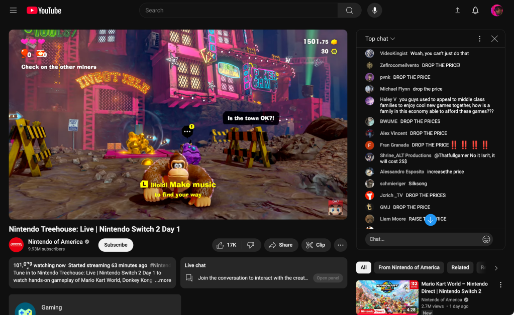 Despite the initial positive reception of Nintendo’s Switch 2 Direct on April 2nd, the price of their newest console, which is $449.99 if not bundled with the $80 Mario Kart World for a total of $499.99, has been the talk of the chat. I mean this literally, as I watched thousands of people voice concerns and make demands in the Nintendo Treehouse: Live chat on YouTube.