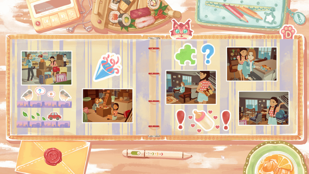 As more pictures enter the margins, some will come with notes on the back that hint at how that set of pictures should be arranged. Once those memories are in order, which never took long for me, you can spend any amount of time decorating the pages by placing cute stickers and tape, adding texts, and changing the background. This photo ordering and scrapbooking is backdropped by the kind of jazzy music that made me feel like I was trading memories with family across a dinner table: warm and happy with a hint of longing and acceptance.